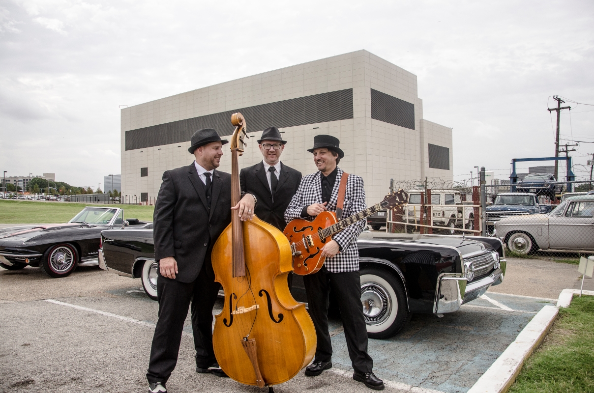 Rockabilly, rock and roll, hot rods, drive-in movies, surfer music, early Elvis, and Sun Records! The classic sound, look, and style of the 1950s and 60s deeply influence the Texas-based band the Vinyl Stripes. Adorned with skinny ties, pork pie hats, Gretsch guitars, a standup bass, and rockin' drums, the Vinyl Stripes bring to life a repertoire filled with classic rockabilly hits from legends like Elvis and Johnny Cash, to Roy Orbison, and Jerry Lee Lewis. They also delve into vintage rock and roll classics by Buddy Holly, Gene Vincent, the Beatles, and can even transport you to the 1960s with surf guitar music! The Vinyl Stripes aren't just about nostalgia; they boast a collection of new original songs that capture the essence of classics from that era. The trio, comprising guitar, upright bass, and drums, showcases all three members singing, in three-part harmony! The Vinyl Stripes can include a fourth member, their sax player, whose rocking tenor saxophone adds another layer to their dynamic performances. Having performed on hundreds of stages across the USA, the Vinyl Stripes have been a highlight for performing arts organizations, city concerts, and more, with a particular focus on their home state of Texas! Photo by Tyler Cogburn.